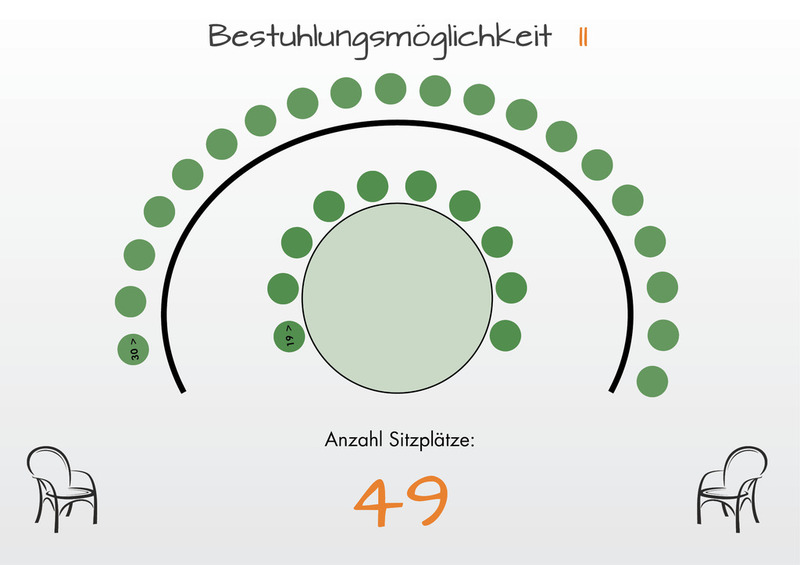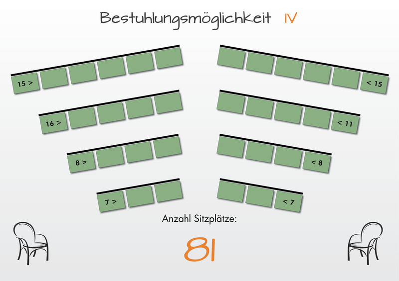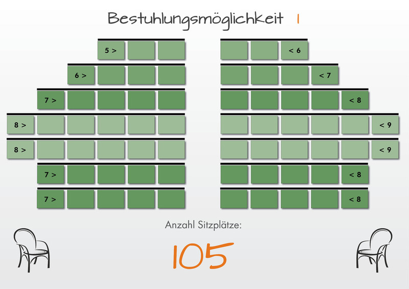 Hier sehen Sie ein paar der möglichen Bestuhlungsmöglichkeiten. Gerne können Sie uns bei individuellen Wünschen kontaktieren.